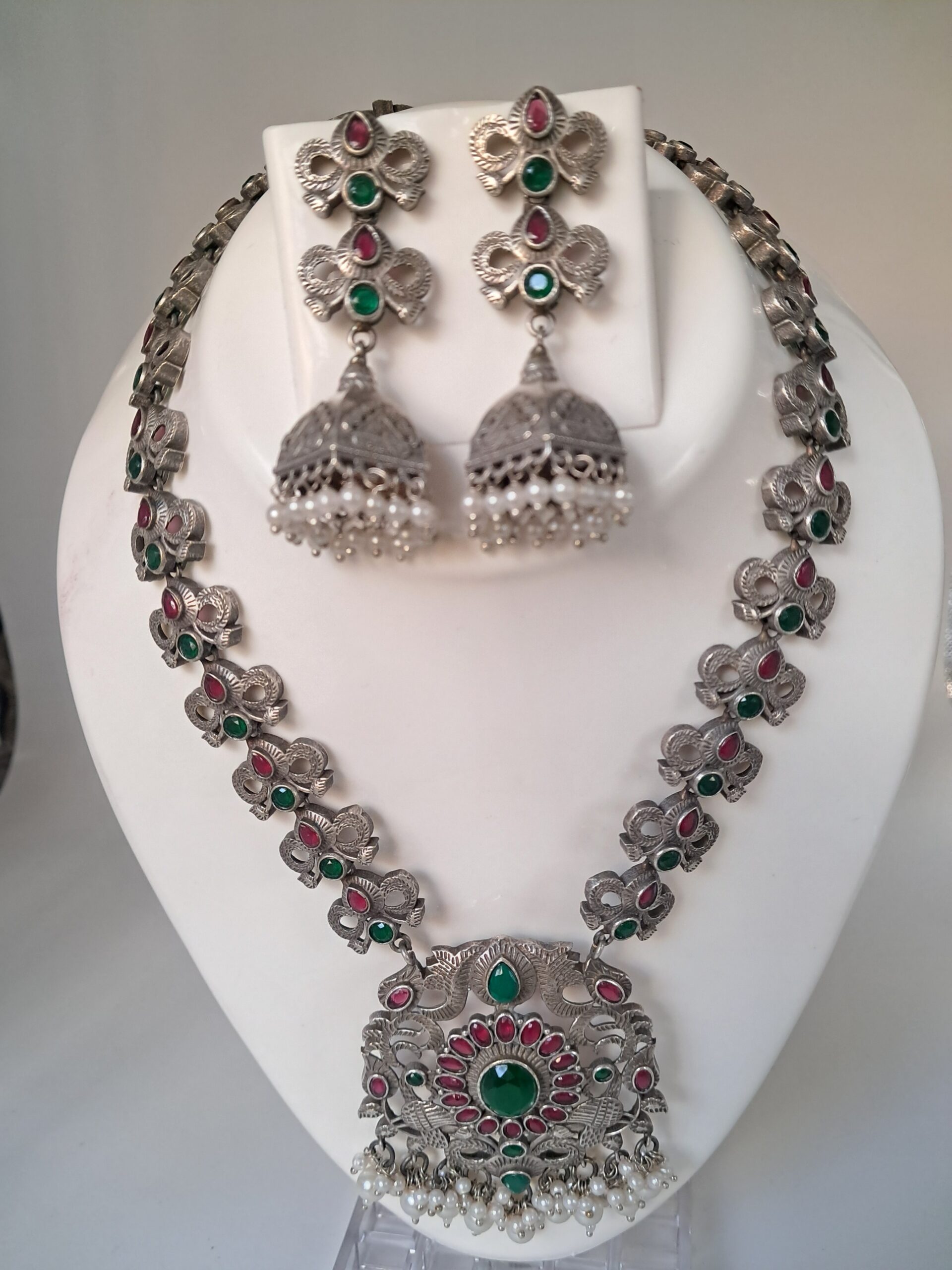 Traditional Oxidized Necklace Set with Jhumka Earrings, Green Red Stones, Ethnic Jewelry