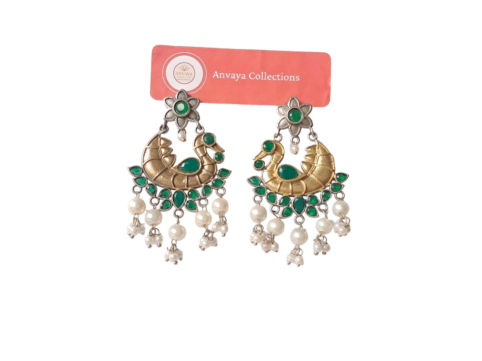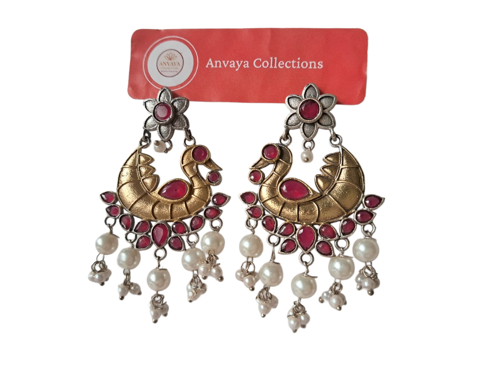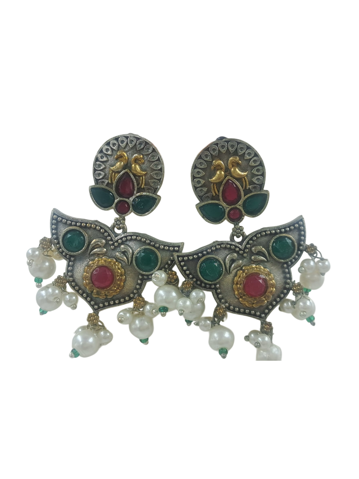 Traditional Earrings, Green and Red Stones with Pearl Drops, Antique Silver and Gold Dual Tone
