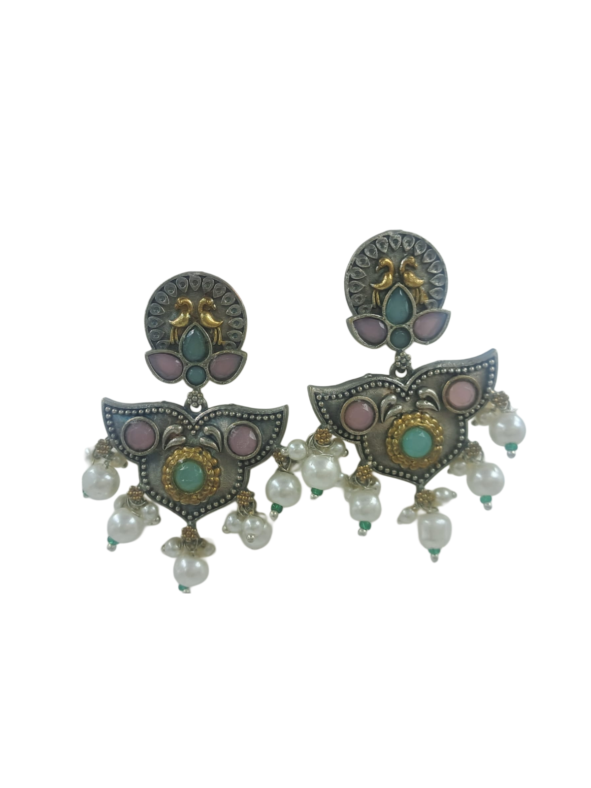Traditional Earrings, Pink and Blue Stones with Pearl Drops, Antique Silver and Gold Dual Tone