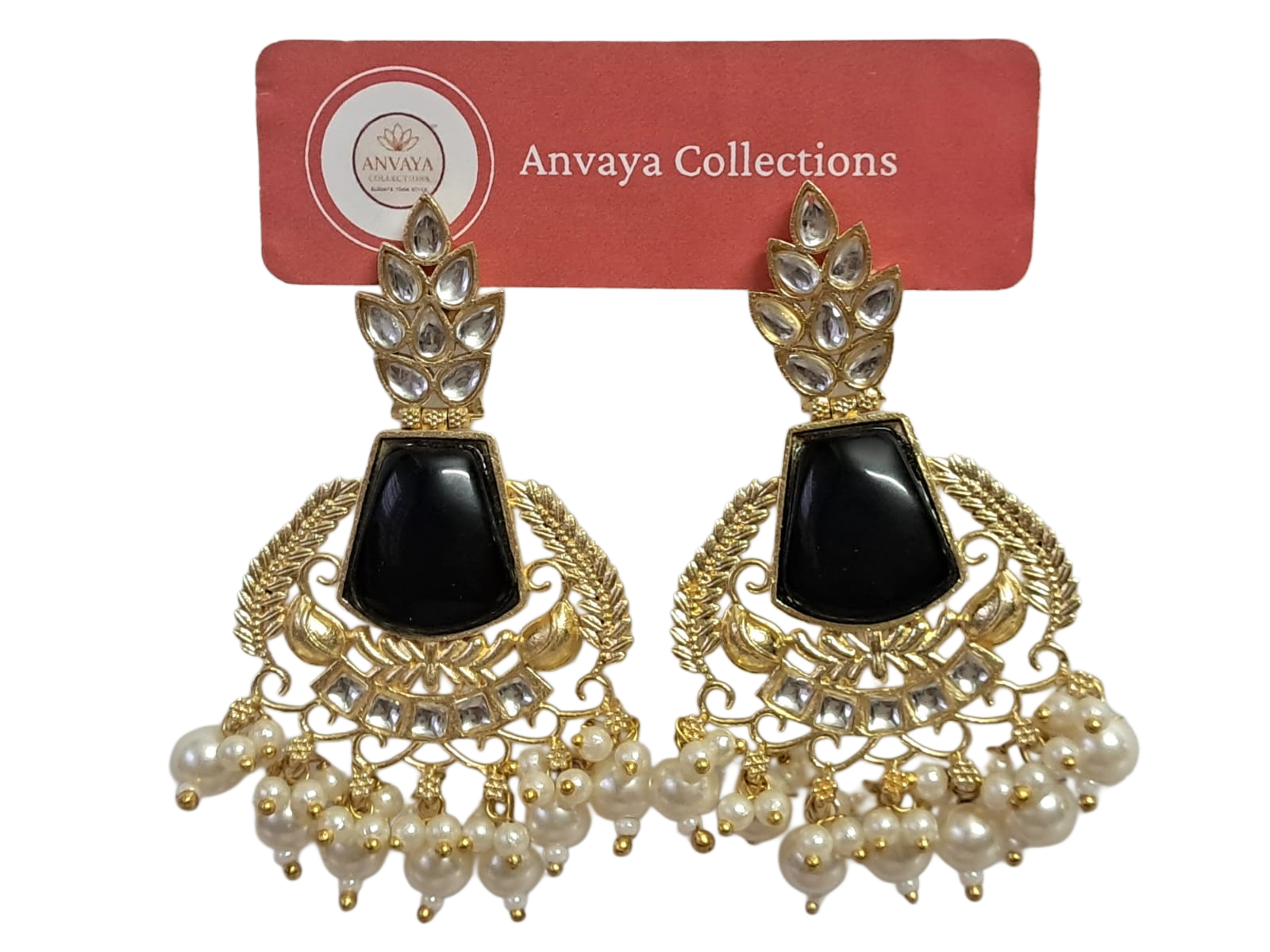 Traditional Kundan Pearl Earrings, Black, White and Gold, Crystal Studded Chandbali Style