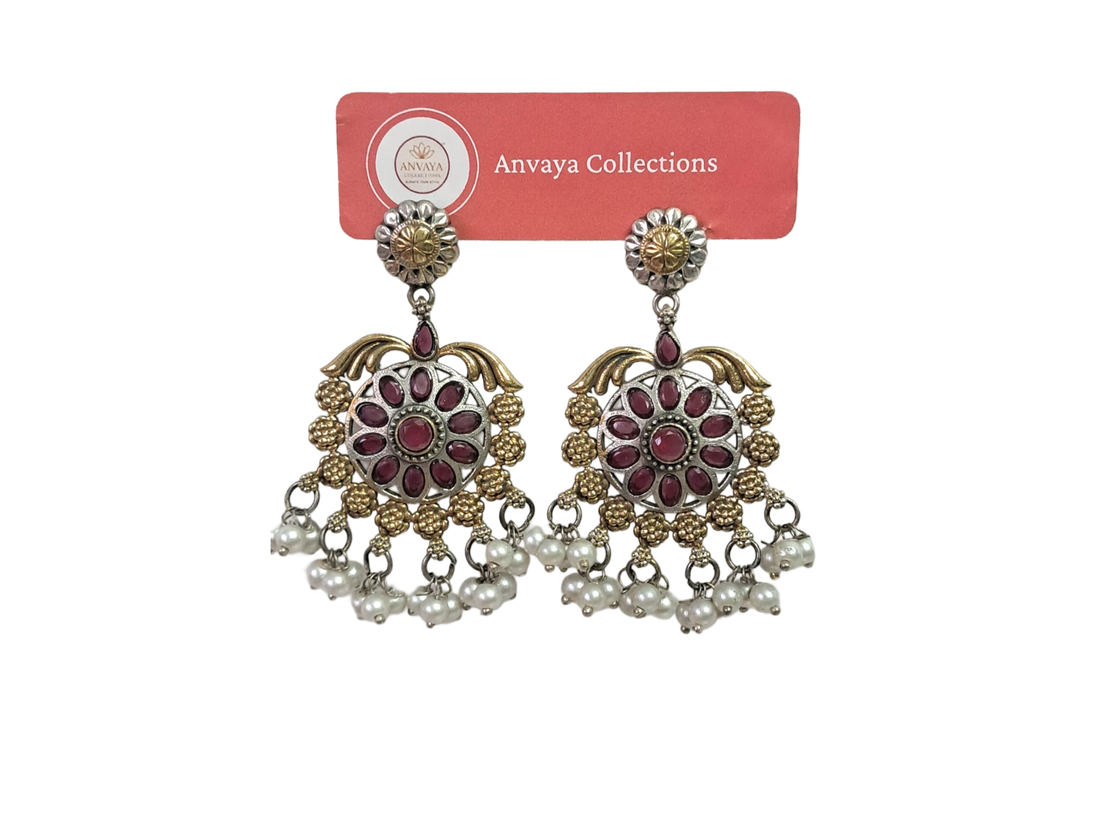 Traditional Floral Earrings, Ruby Red and Gold-Toned, Pearl Beaded Chandelier Design