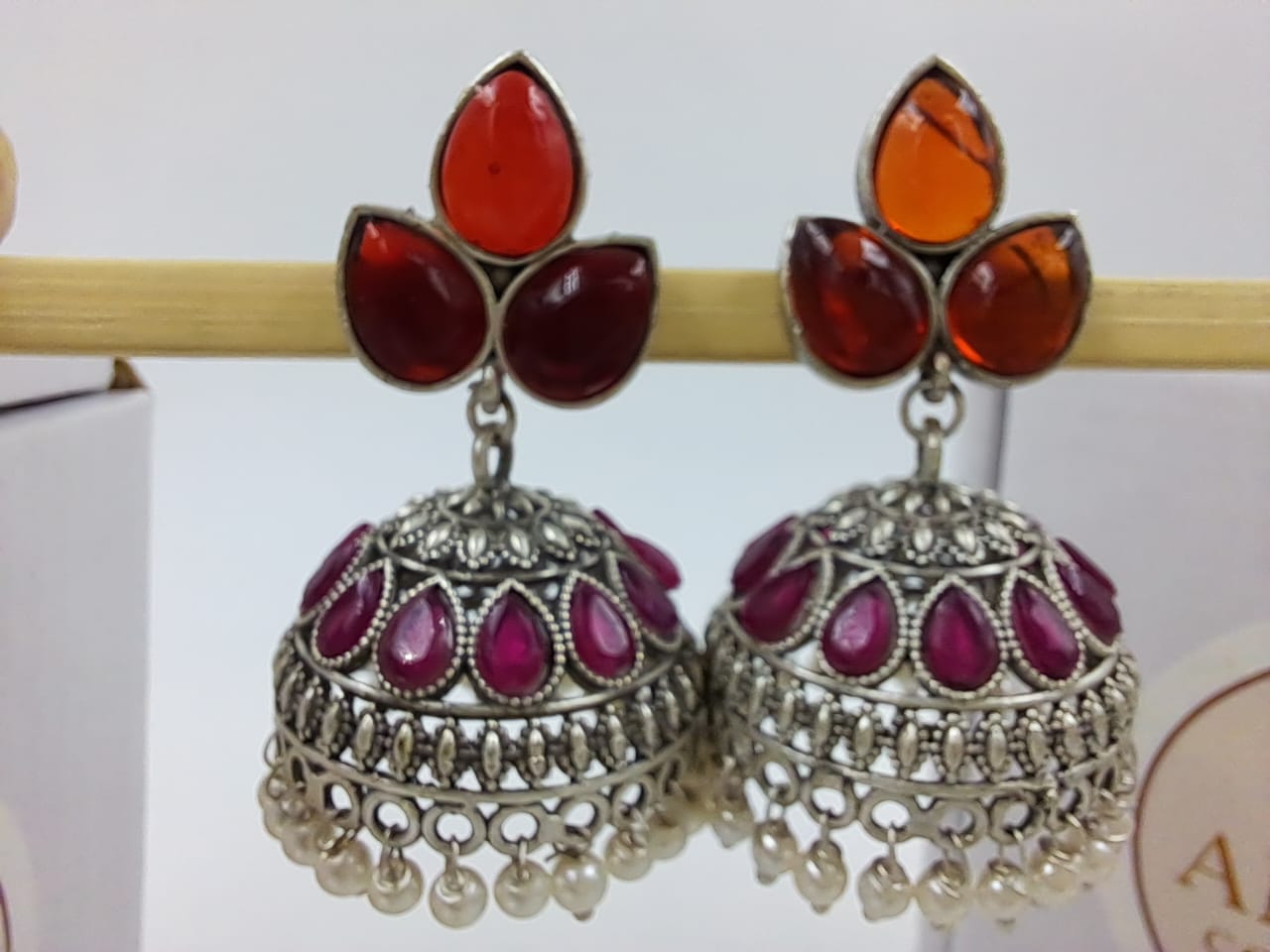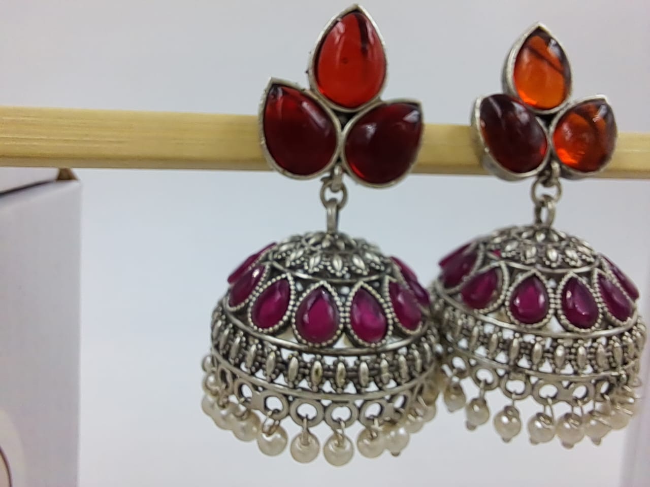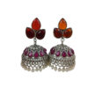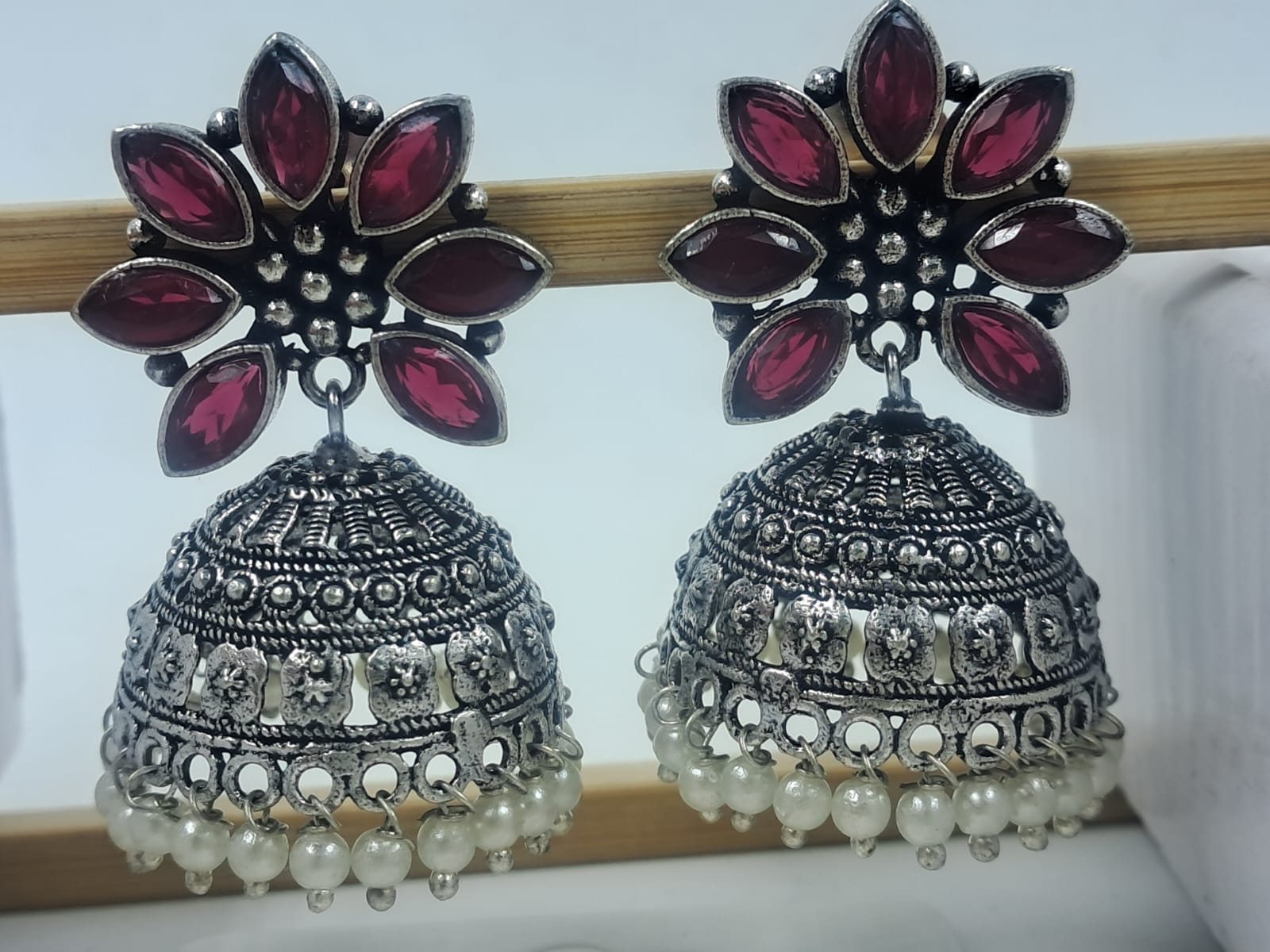 Anvaya Collections Elegant Oxidized Silver Jhumka Earrings with Red Stone and Pearl Detailing