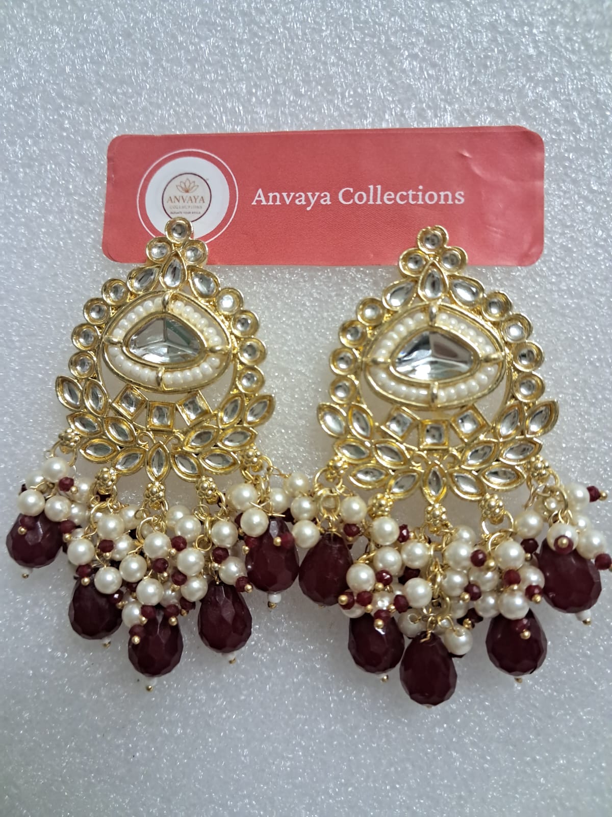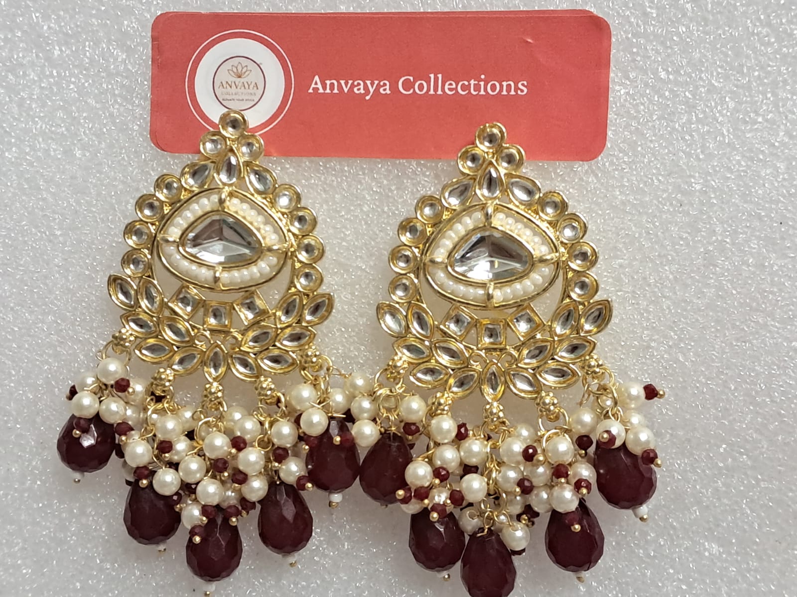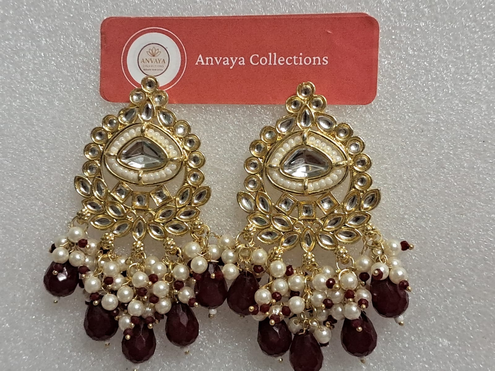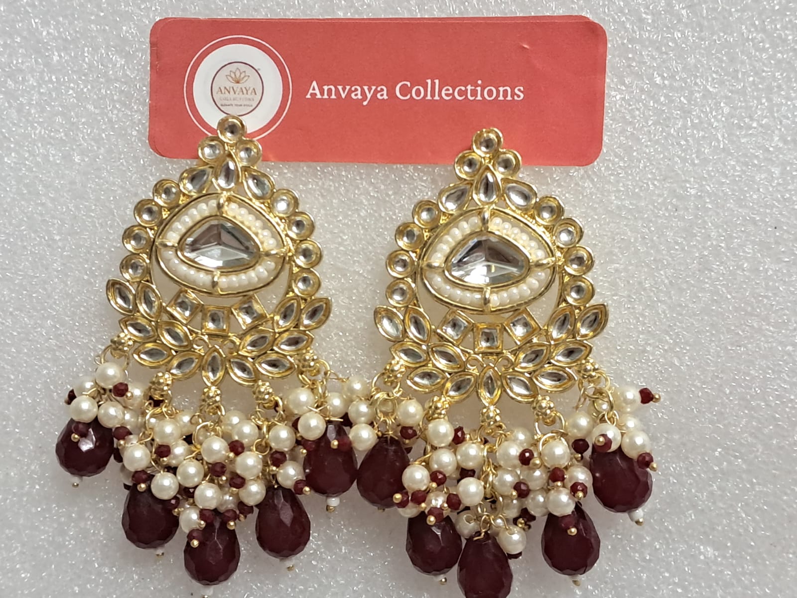 Elevate your traditional ensemble with these exquisite Anvaya Collections Kundan pearl drop earrings. These stunning pieces feature an intricate gold-plated design adorned with pristine Kundan stones arranged in a teardrop pattern. The earrings showcase delicate pearl embellishments complemented by rich maroon beaded drops, creating a mesmerising cascade effect. The ornate detailing includes multiple layers of Kundan stonework surrounded by pearl accents, making them perfect for special occasions and festivities. The combination of classic pearls with deep maroon beads adds a sophisticated touch to these traditional earrings. Their substantial yet elegant design makes them a versatile accessory that pairs beautifully with both traditional Indian attire and contemporary fusion wear. These earrings are crafted to make a statement while maintaining a timeless appeal that celebrates traditional Indian craftsmanship.