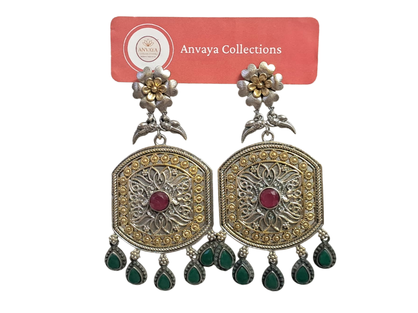 Original price was: ₹899.00.₹699.00Current price is: ₹699.00.Dual-Tone Floral Earrings with Ruby Centre and Emerald Red Drops, Traditional Design