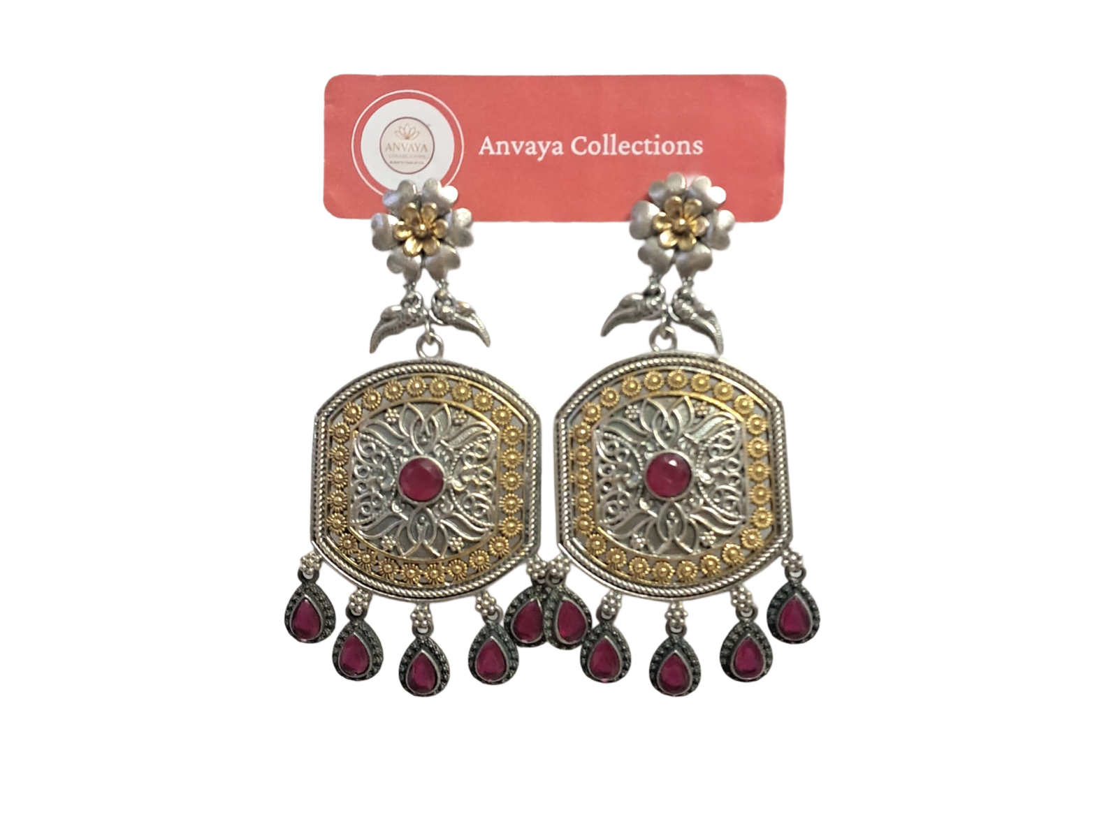 Discover the exquisite craftsmanship of Anvaya Collections' dual-tone traditional earrings. These statement pieces showcase a stunning octagonal...