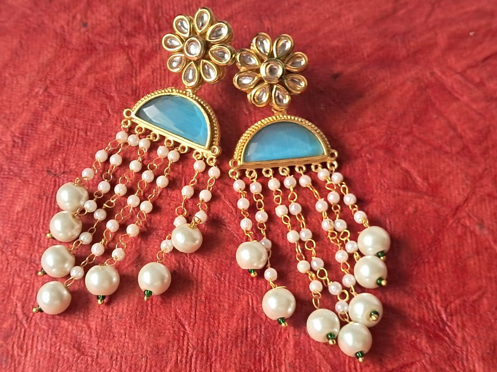 Original price was: ₹799.00.₹499.00Current price is: ₹499.00.Designer Pearl Drop Earrings, Gold-Plated, Turquoise Semi-Circle with Crystal Flower Studs, Traditional Indian