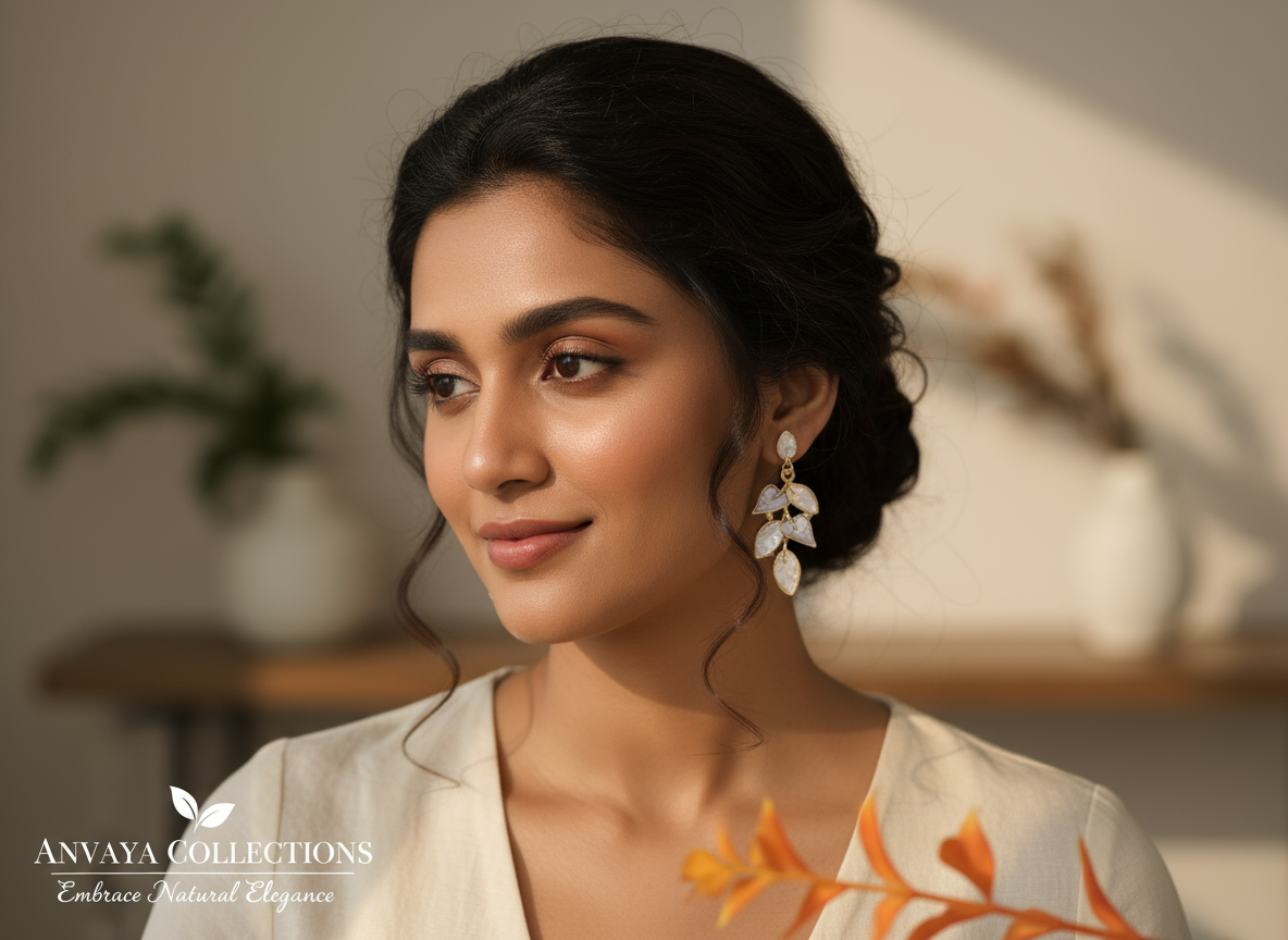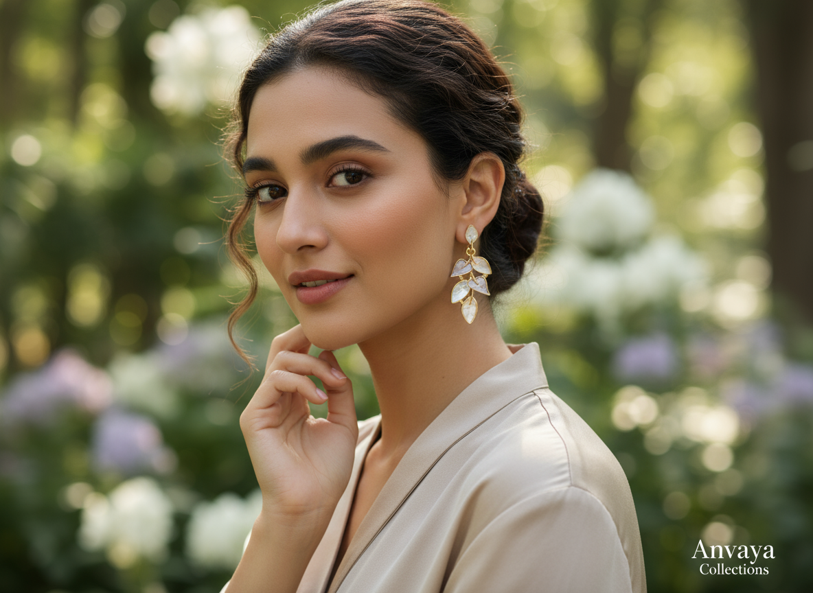 • DESIGN: Elegant cascading leaf pattern featuring six iridescent heart-shaped leaves in pearl white, arranged in a graceful dangle style