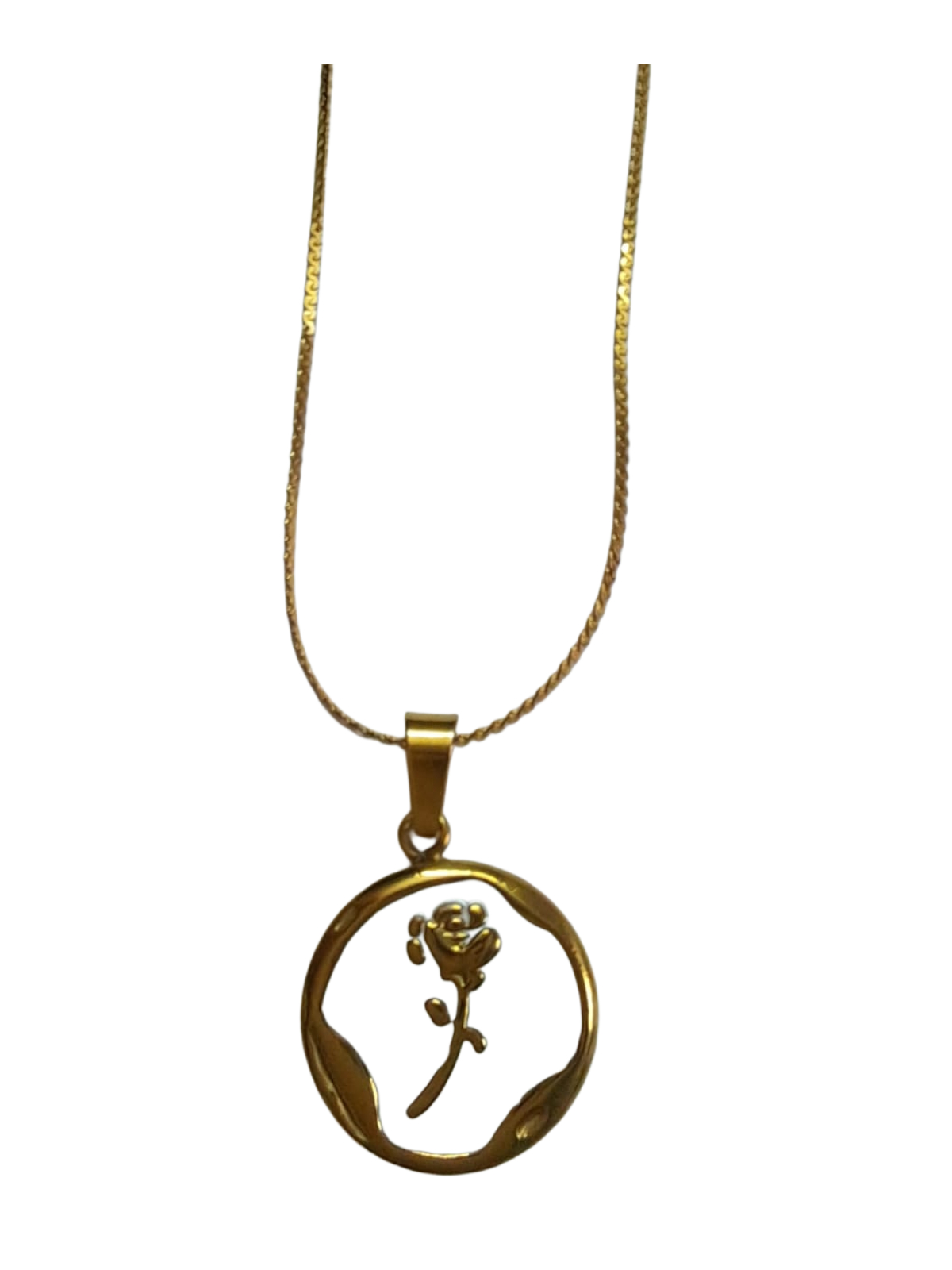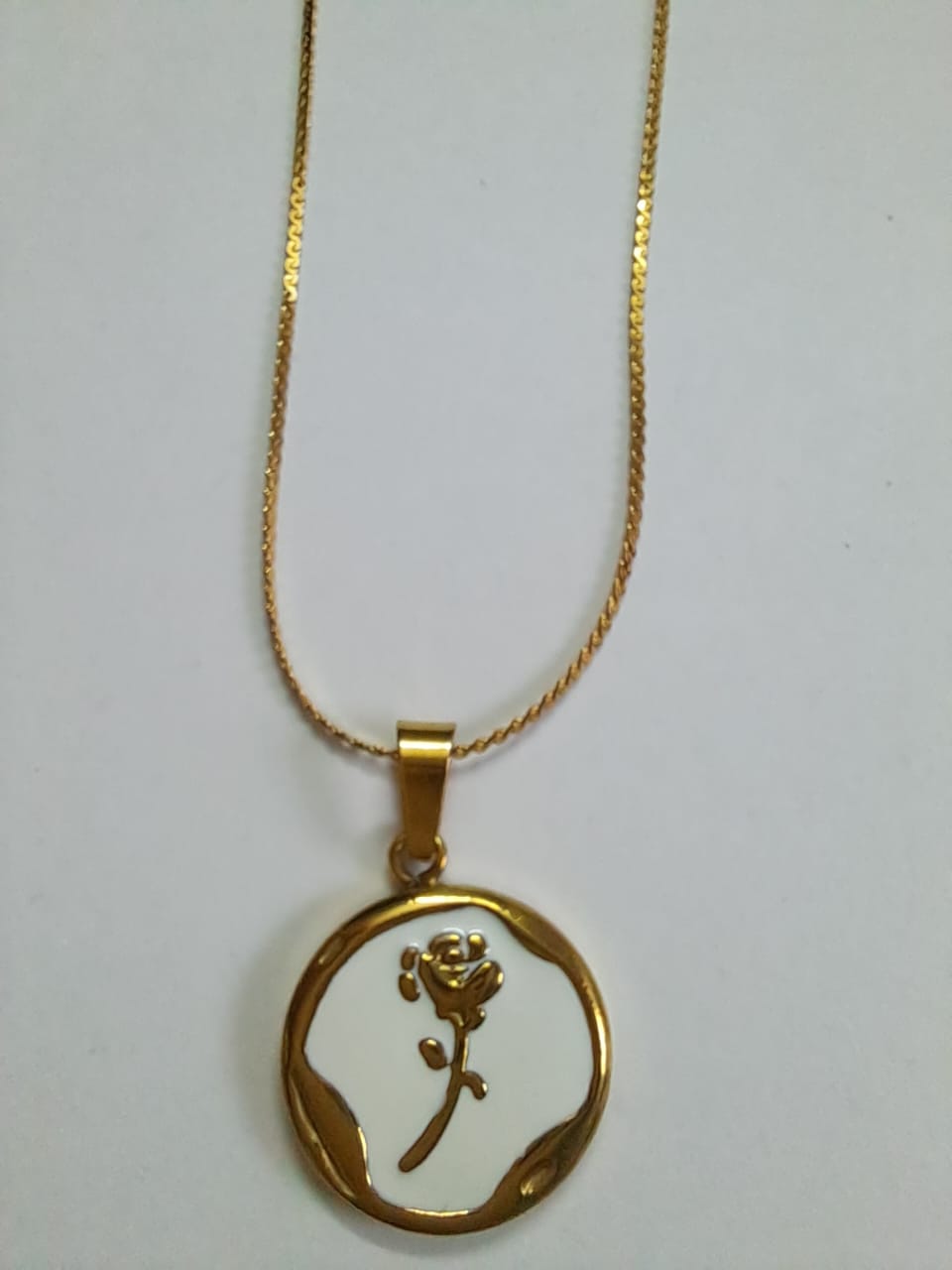 Gold-toned circular pendant featuring a delicate rose motif with white enamel background, creating an elegant and timeless look