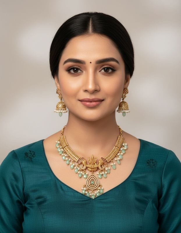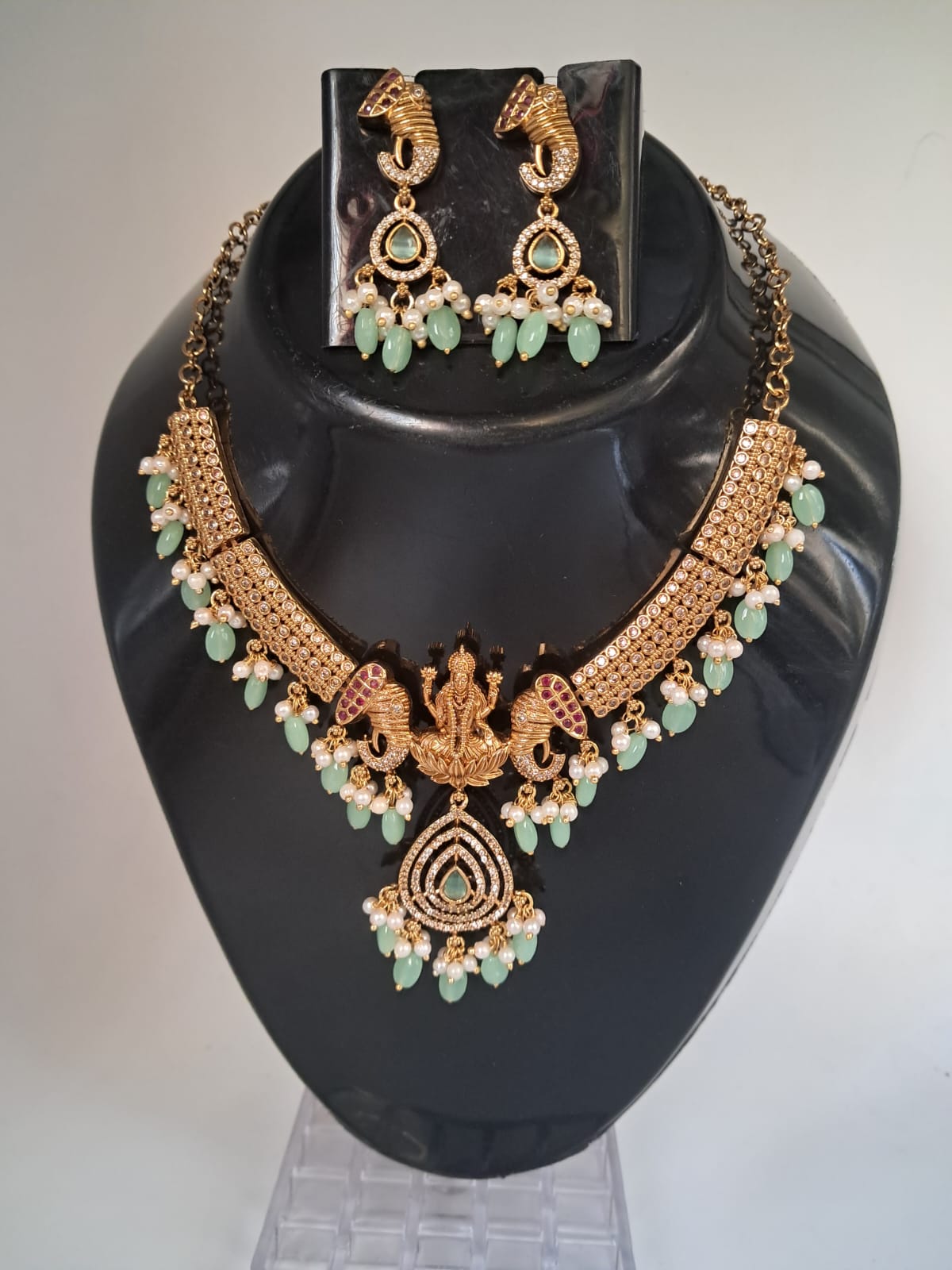 - Â Indian temple jewellery set featuring an intricately crafted Goddess Lakshmi centerpiece seated on a lotus, flanked by decorative peacock motifs symbolising prosperity and elegance