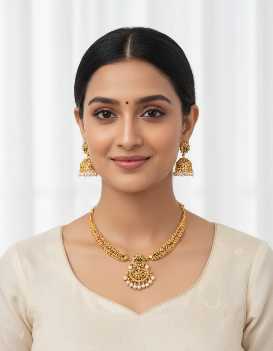 • COMPLETE JEWELLERY SET: Traditional gold-toned necklace and matching earrings set perfect for weddings, festivals, and special occasions