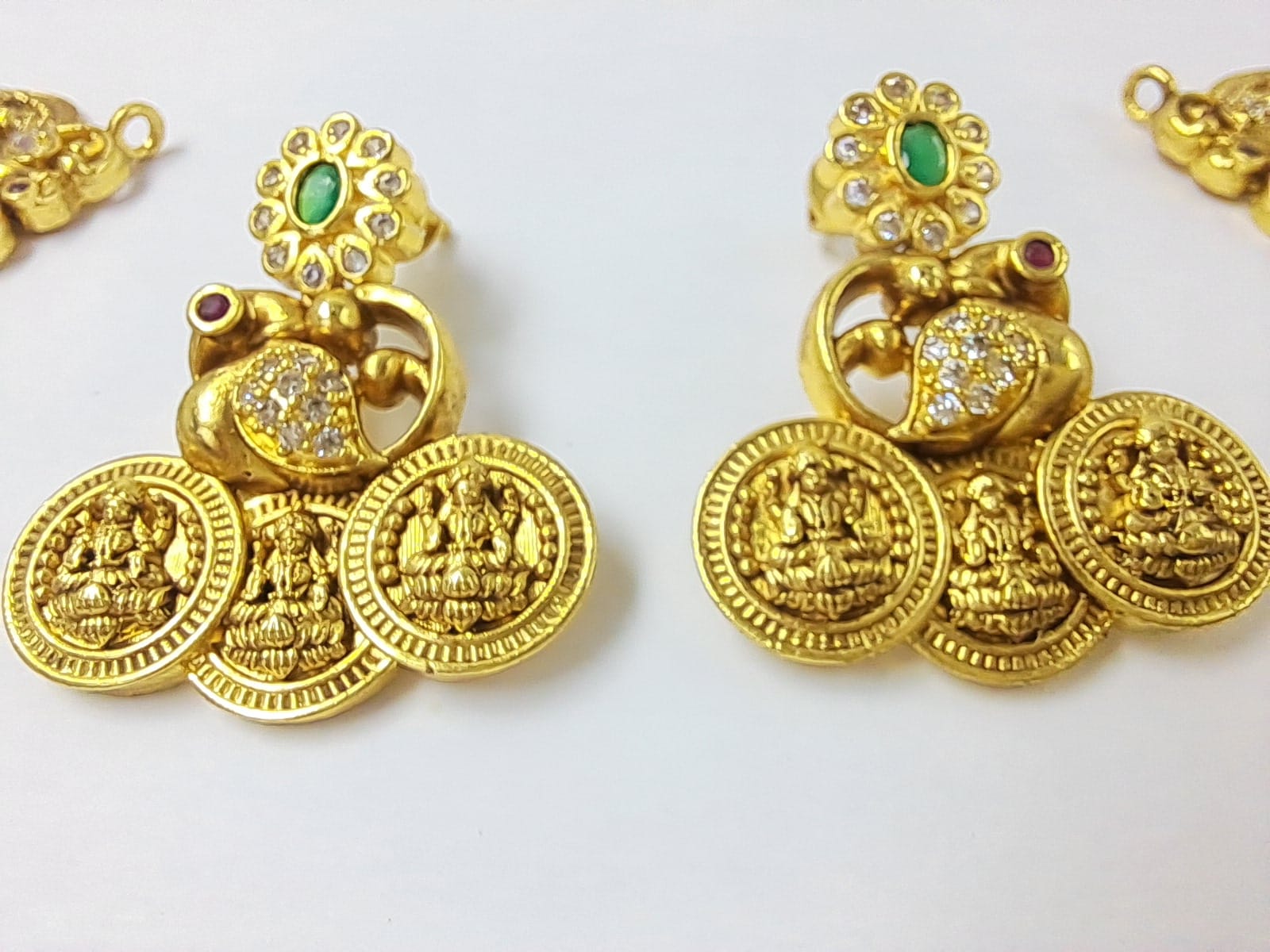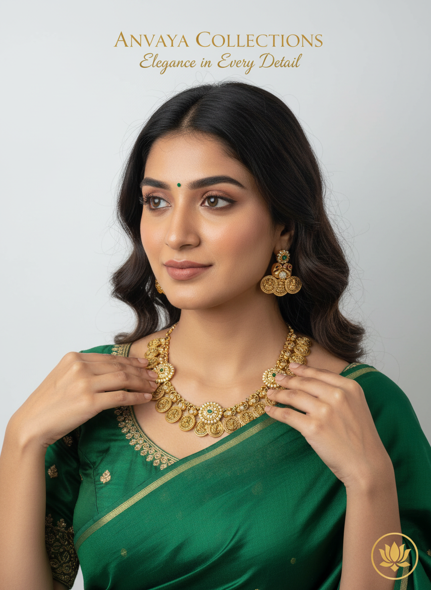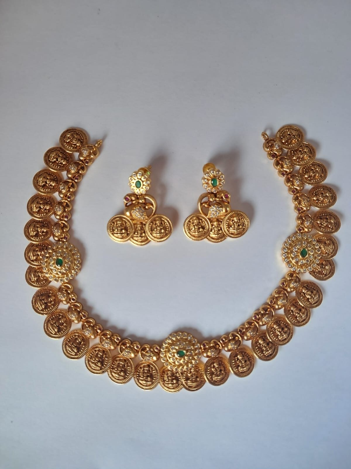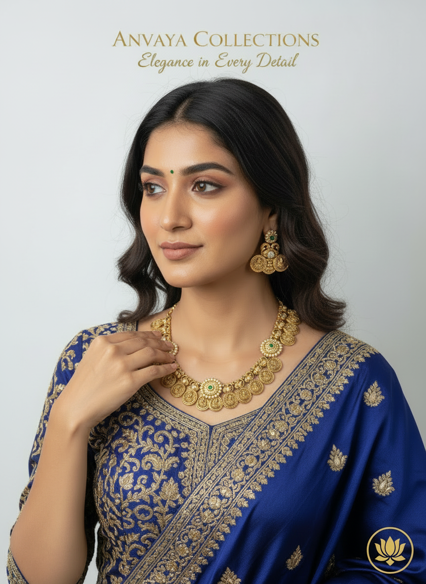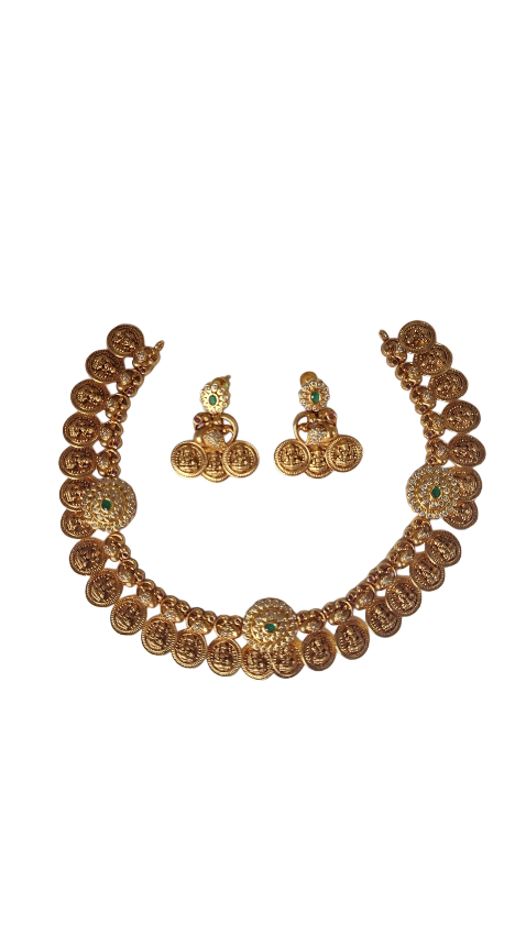 - TEMPLE COIN PATTERN: Features multiple circular coin pendants with embossed goddess figures arranged in a classic temple jewellery style, creating a regal and traditional appearance