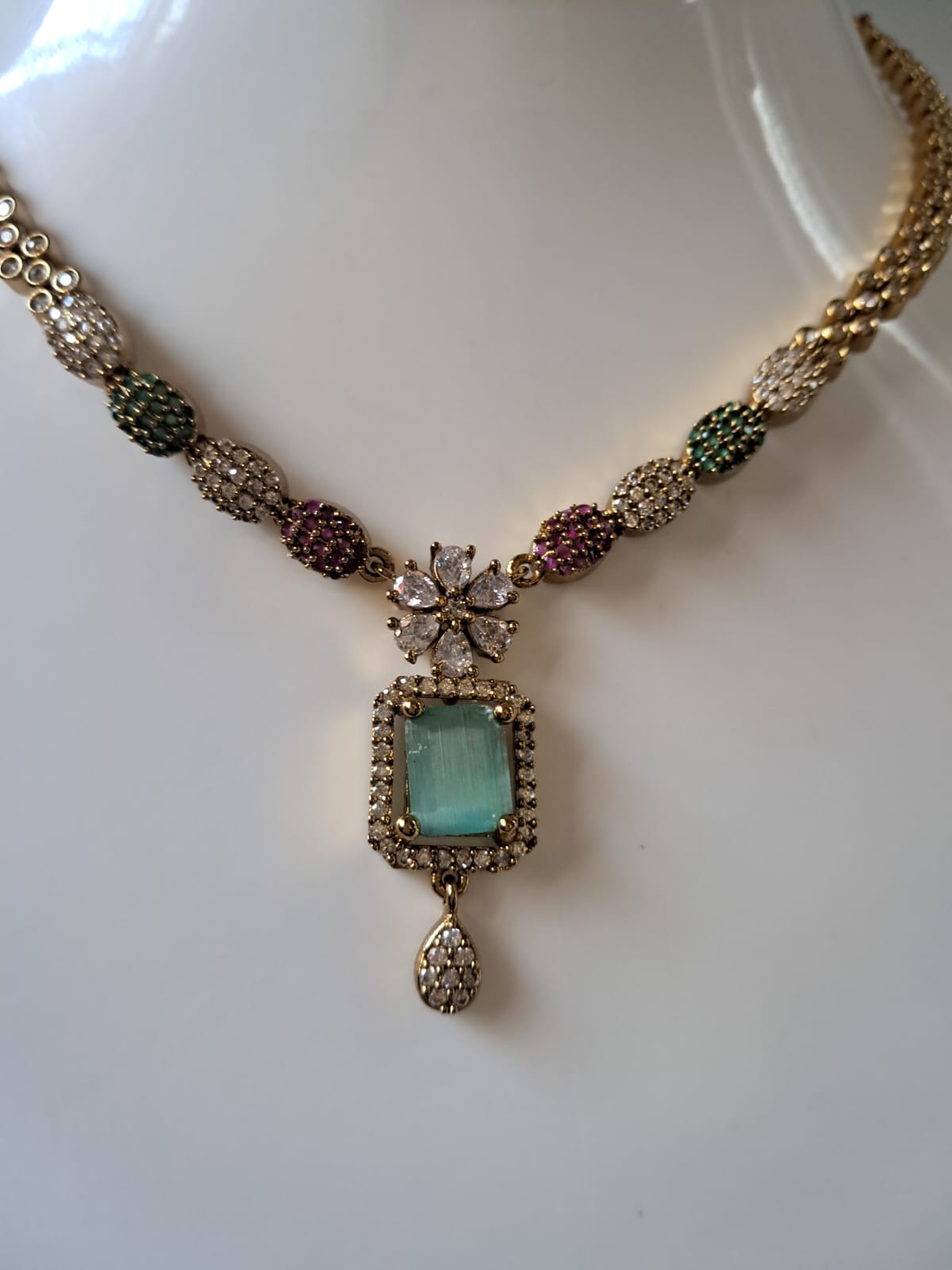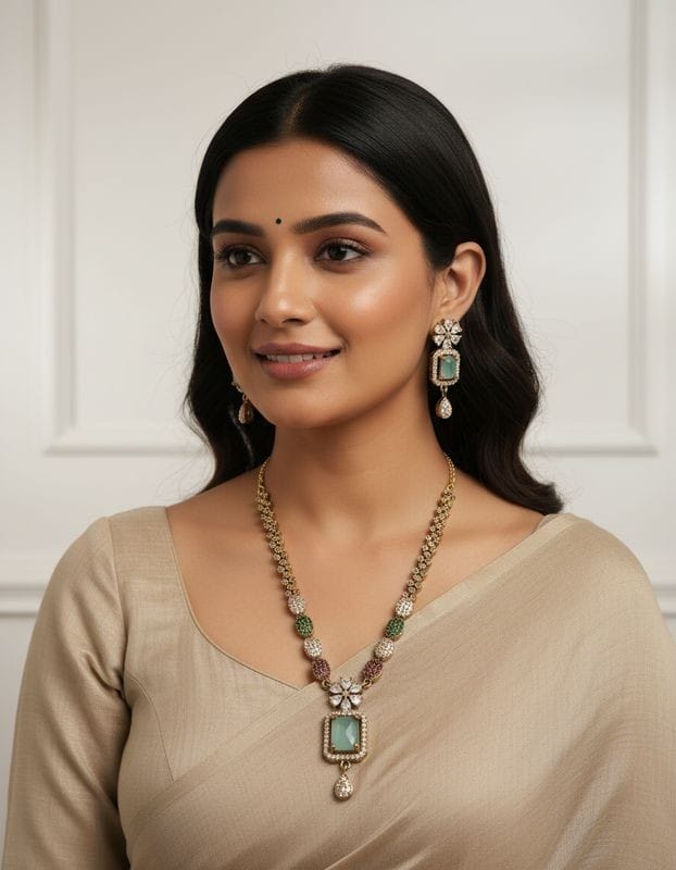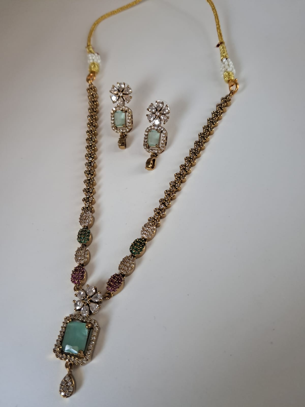 - ELEGANT DESIGN: Traditional gold-toned necklace and earring set featuring a stunning light Green stone pendant and intricate beaded pattern