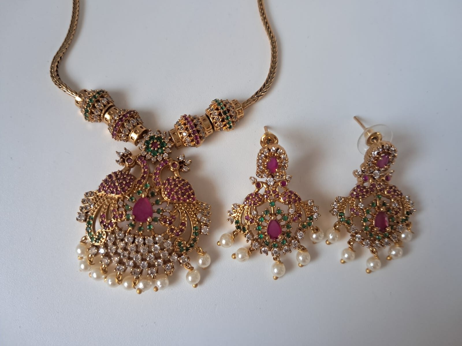South Indian Peacock Design Necklace Set with Matching Earrings, Jewelry with Pink Stones, Green Stones and Pearl Drops